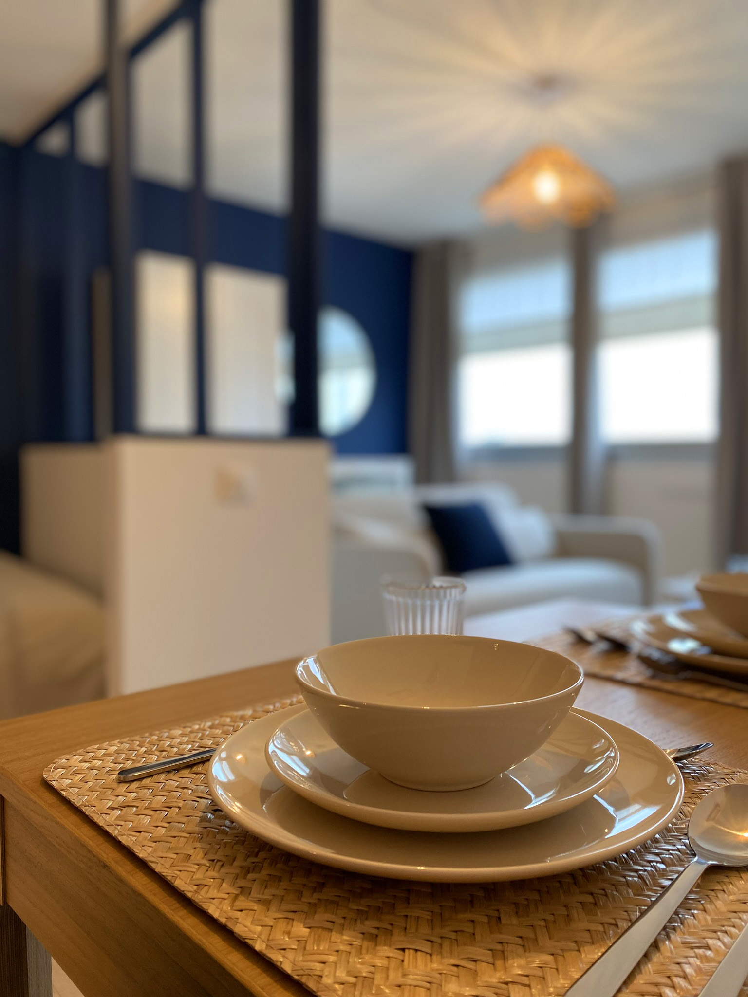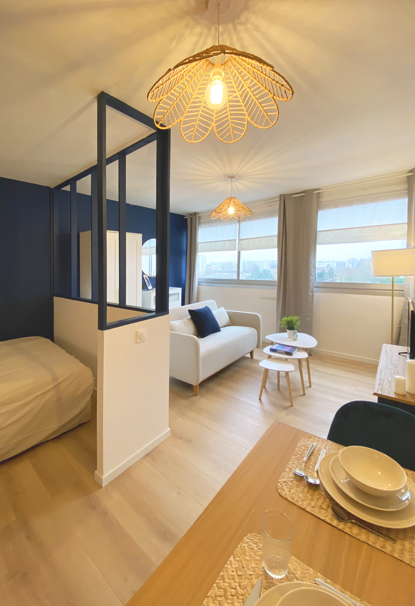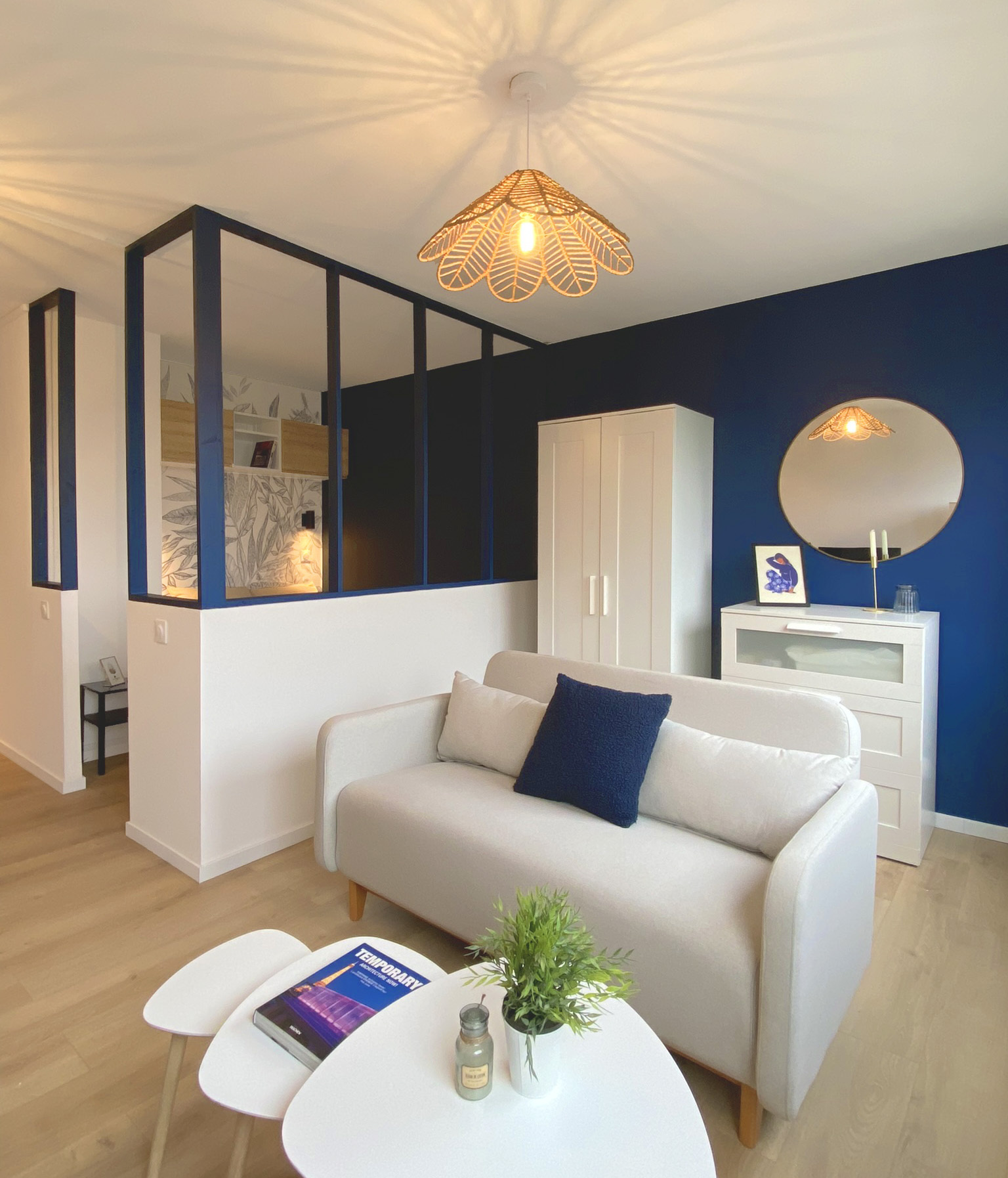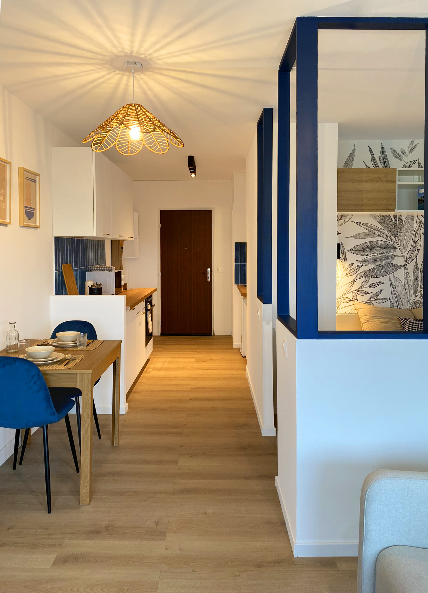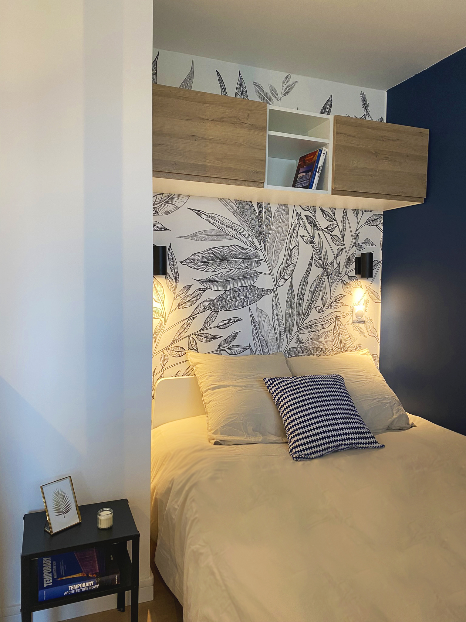 Le coin nuit a été valorisé par l’ajout d’une verrière bleu nuit et d’un papier peint panoramique végétal, apportant profondeur et caractère à l’espace. Ce parti pris décoratif permet de se démarquer sur le marché locatif, sans alourdir le budget travaux.